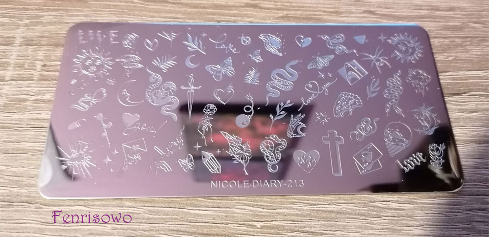 Poniżej blaszki do stempli Nicole Diary i pyłek Born Pretty. Z blaszek wzór odbija się bardzo dobrze. Pyłek mieni się na niebiesko-fioletowo-zielono.